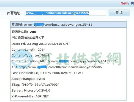 面對這樣情況,小編做了下面的兩個(gè)工作。第一是,制作了一個(gè)404.asp頁面上傳到服務(wù)器,結(jié)果返回的依然是200;第二,查詢了同一IP的其他網(wǎng)站的不存在的URL,結(jié)果同樣返回的是200。這個(gè)結(jié)果告知我的就是,404頁面返回200的原因是服務(wù)器問題。